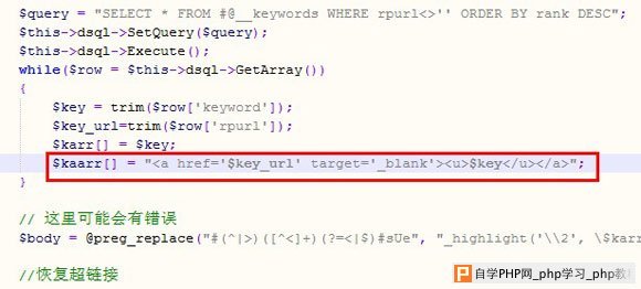 第四步:进一步优化,修改源文件:include/arc.archives.class.php,给这个超链接加了一个<u>的标签,如下图,其实我们可以给它改为<strong>,关且给关键词加上比较醒目的红色,方便阅读者区分.
