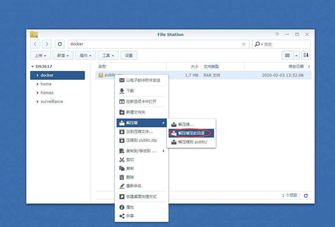 二、登录群晖系统,打开File Station,在docker文件夹下,右键把刚才下载的文件public.rar上传到群晖;