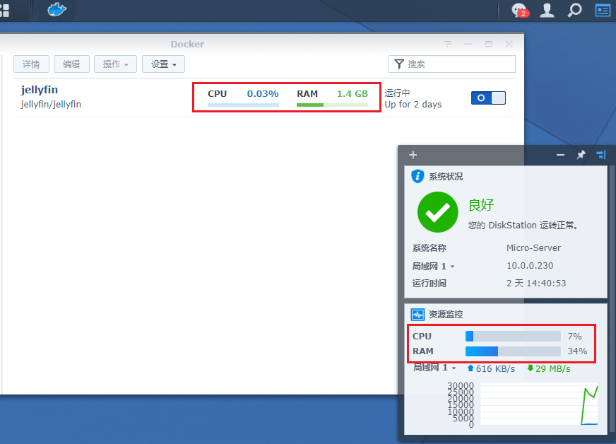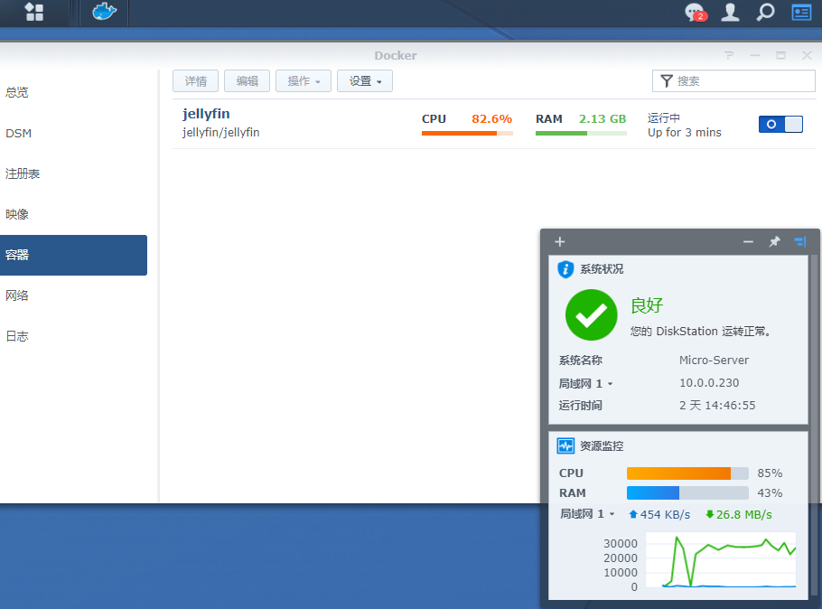 打开群晖分别查看 Docker容器,以及系统的CPU占用。
