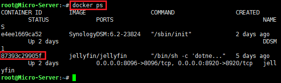在输出结果中找到jellyfin的CONTAINER ID,记下来,本例的ID是87393c29905f;