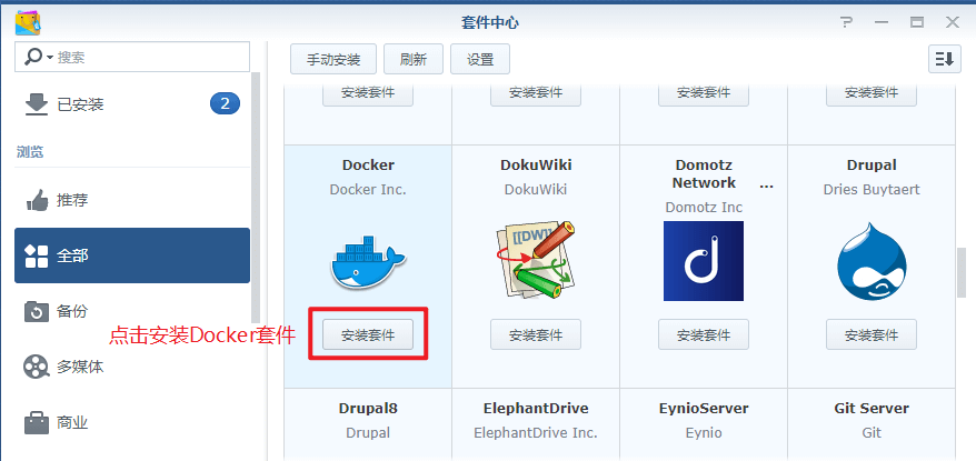 1. 在群晖的套件中心,安装Docker套件。