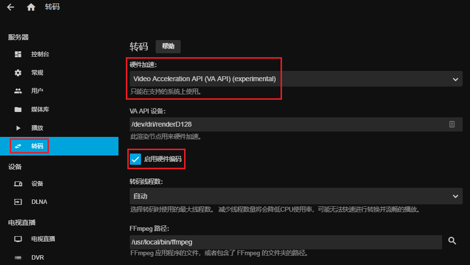 Jellyfin 后台启用硬件转码功能 [ 硬件加速选择:Video Acceleration API (VA API)(experimental) ,并勾选“启用硬件解码” ]