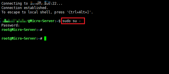 4. 利用我们的管理员账号、密码通过ssh客户端登陆群晖系统。 通过 sudo su – 命令切换为root用户