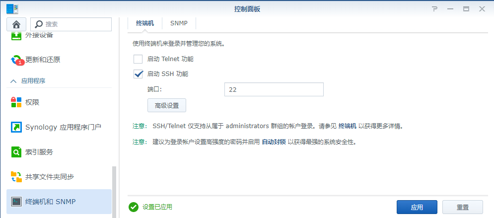 3. 群晖系统中打开SSH功能 (控制面板->终端机和SNMP->启动SSH功能->应用)