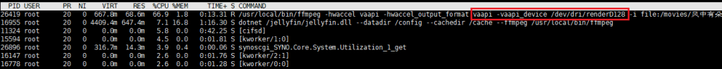 同时,我们链接群晖的SSH 通过 top 命令查看解码过程是否调用了显卡驱动: