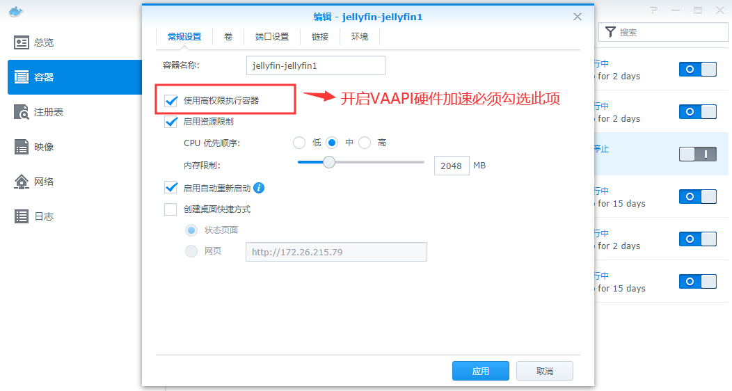 (1)给容器提权:在Docker容器中找到Jellyfin的容器,先关掉,点编辑容器的常规设置,勾选“使用高权限执行容器”;