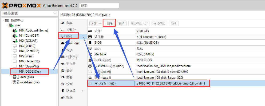 六、回到群晖虚拟机的硬件那里,删掉原有的E1000网卡;