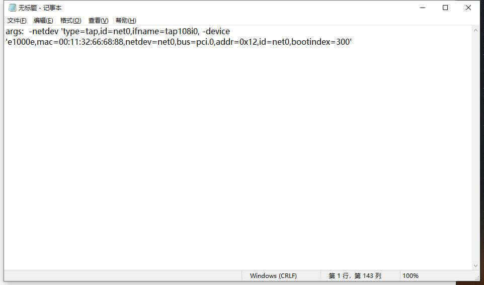 args: -netdev 'type=tap,id=net0,ifname=tap108i0, -device 'e1000e,mac=00:11:32:66:68:88,netdev=net0,bus=pci.0,addr=0x12,id=net0,bootindex=300'