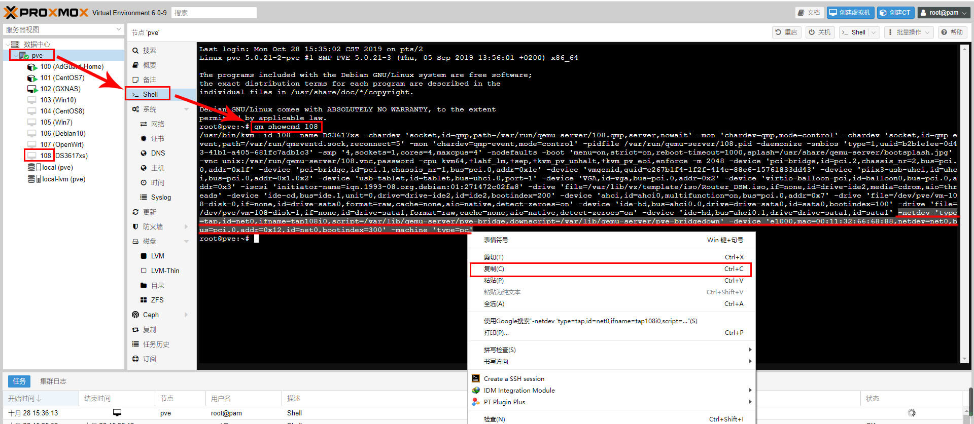 二、进入PVE系统的Shell界面,输入 qm showcmd 108 回车(要注意108这个ID必须你的群晖虚拟机ID相符),会显示出来一大堆英文,我们只需要找到后面这些内容: