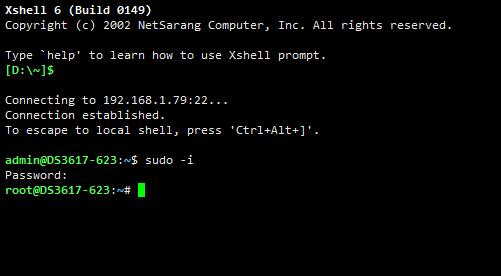 在电脑上打开xshell登录群晖进入SSH状态,输入sudo -i获取root权限;