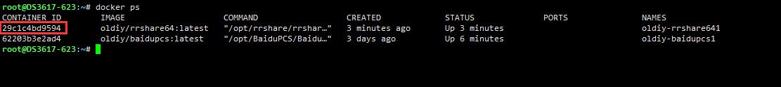 输入docker ps,查看当前人人影视的ID,以我为例,这个ID为29c1c4bd9594的右边写着:oldiy/rrshare64,就是人人影视了。记下这个ID;