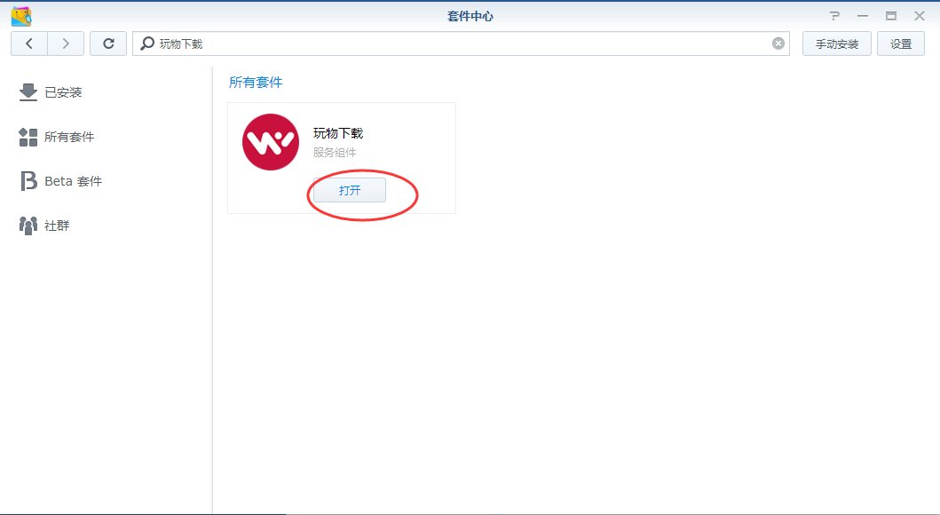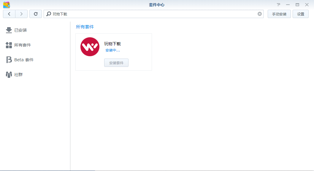 打开桌面的套件中心,在搜索栏输入“玩物下载”,搜索,找到“玩物下载”点安装套件;(如果你只有一个存储池,或者你设置了默认的安装套件到某个存储池,此时不会有任何提示。否则会弹出提示你安装到哪个存储池,请根据自己需要做选择,建议选择空间大的存储池做为下载)如果你没有找到这个套件,可能是没有使用第三方的套件源:http://packages.synocommunity.com,请自行添加;