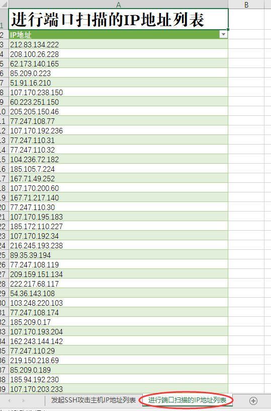 三、文件里面有两个表格,分别是“发起SSH攻击主机IP地址列表”和“进行端口扫描的IP地址列表”;