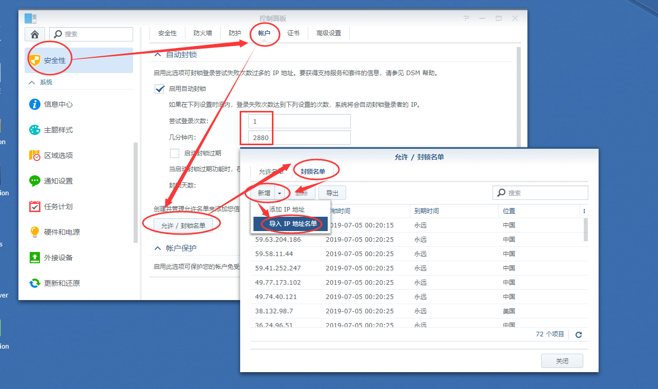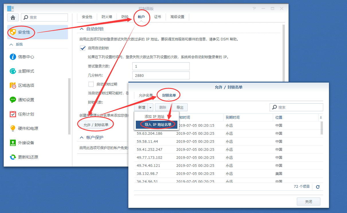 十六、回到群晖桌面,打开控制面板,进入“安全性”—“账户”—“允许/封锁名单”—“封锁名单”—“允许/封锁名单”—“新建”—“导入IP地址名单”;