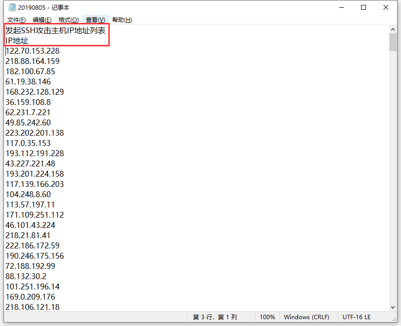 六、在第一个表格“发起SSH攻击主机IP地址列表”,点EXCEL的菜单,另存为,文件名自己起一个,保存类型选择“Unicode文本”,点“保存”;