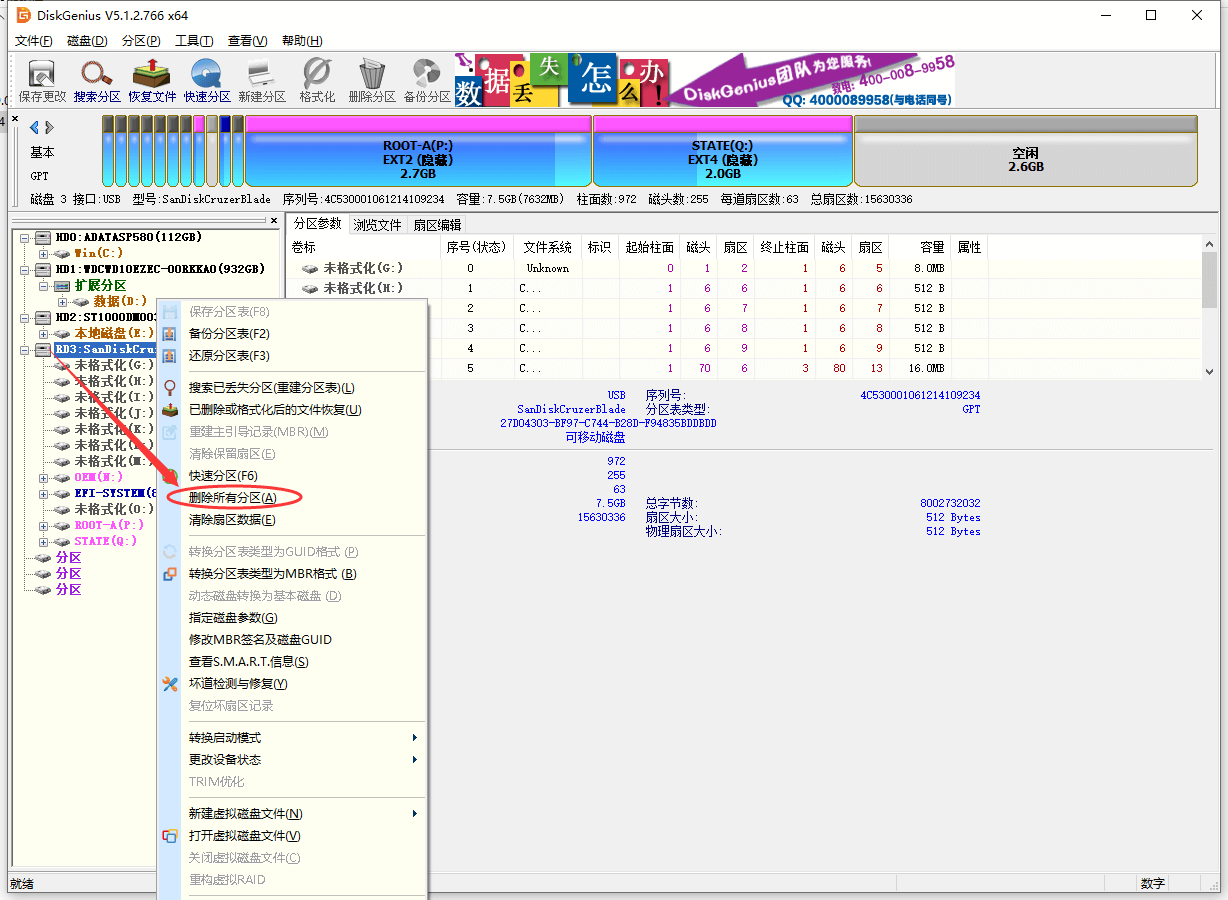 2、在左边区域找到U盘,点鼠标右键,选择删除所有分区
