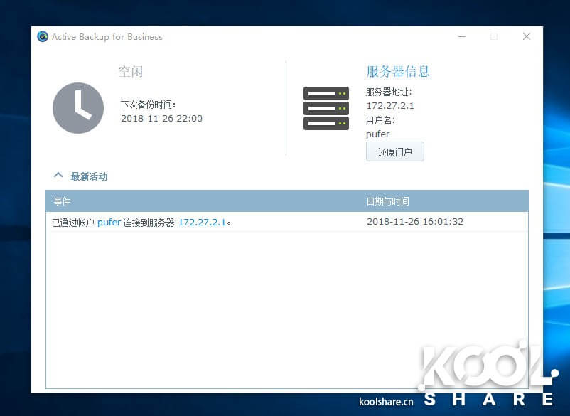 Active Backup for Business会出现两个套件入口,Active Backup for Business是主要的管理工具,而Active Backup for Business Portal是附属工具,管理员可以授权用户使用附属工具自主完成还原和查看备份进度的工作。
