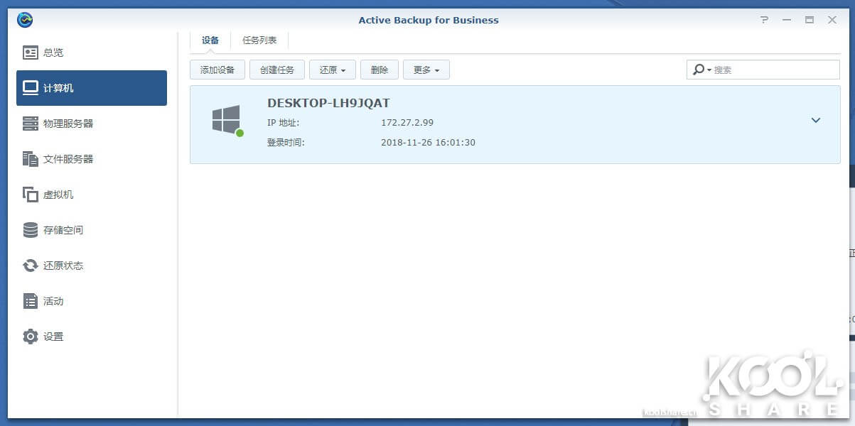 在Agent安装完成后,可以看到Active Backup for Business的管理界面内,计算机就多了一台。对于大型企业IT,可以批量安装好Agent后来这边统一管理PC。
