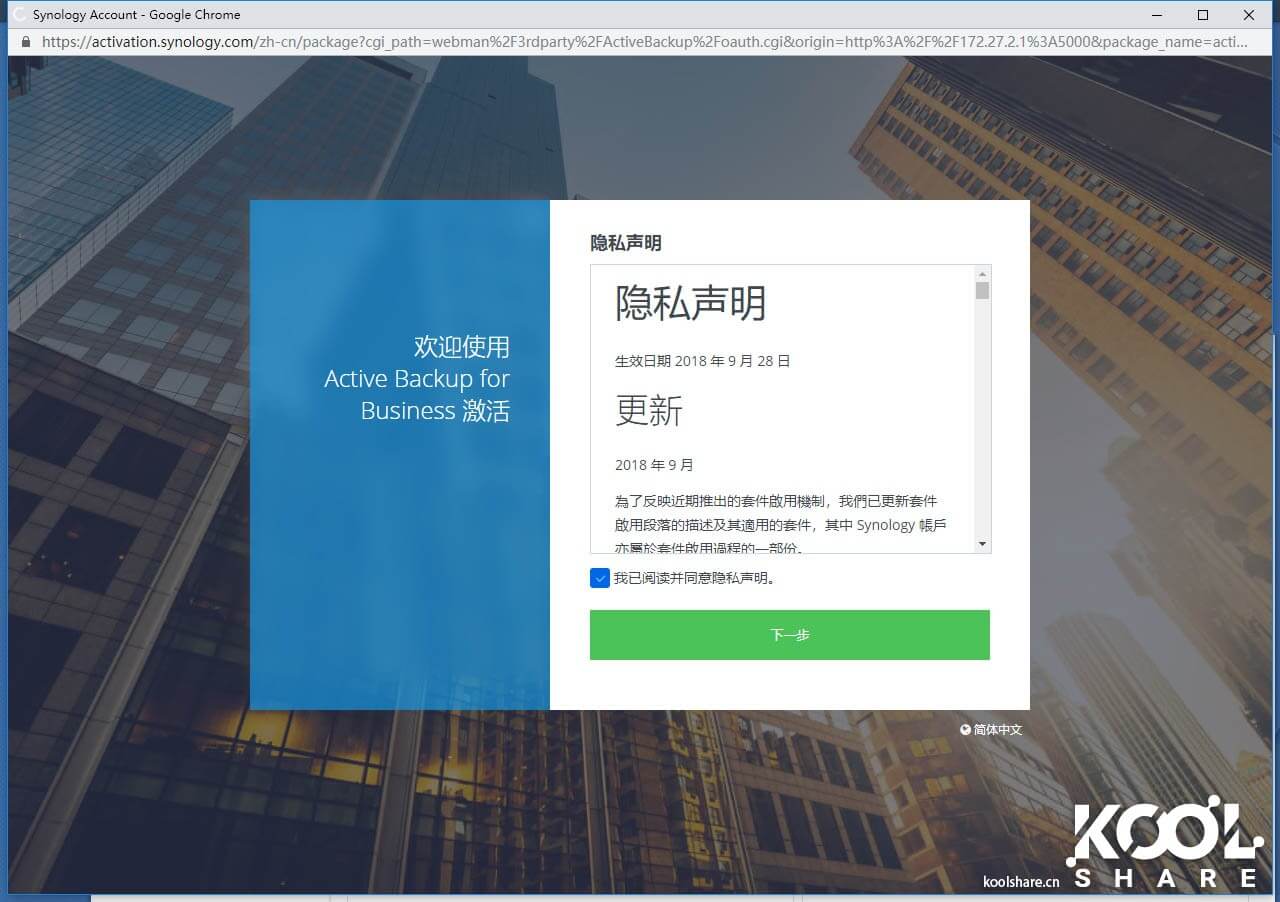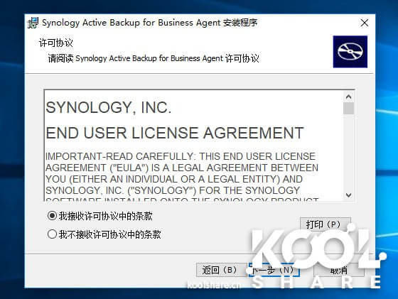 激活方法很简单,只需要同意Active Backup for Business的用户授权许可。