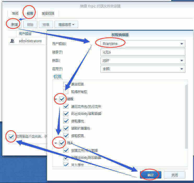 二、打开群晖桌面的File Station,在frpc目录上点右键“属性”—“权限”,给目录添加Everyone用户组的读写权限: