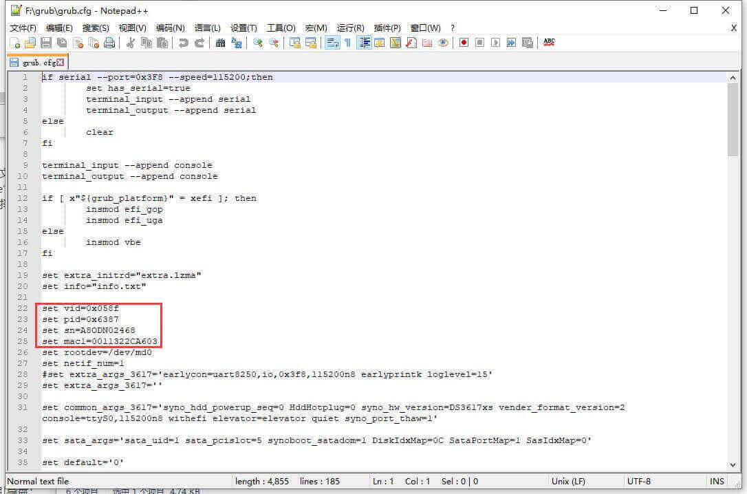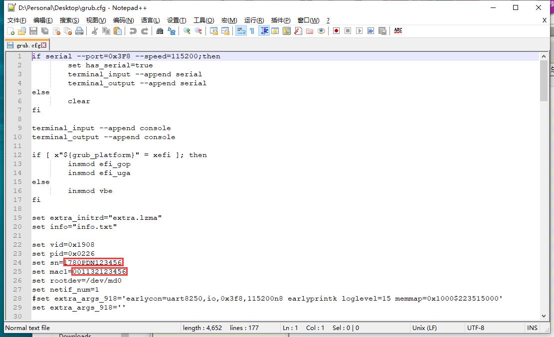 (6)用Notepad++编辑器打开grub.cfg(不要用记事本打开编辑,否则格式会错乱),找到第24-25行,sn和mac1这两行等号后面的值,根据实际修改,修改无误后保存,关闭Notepad++ ;