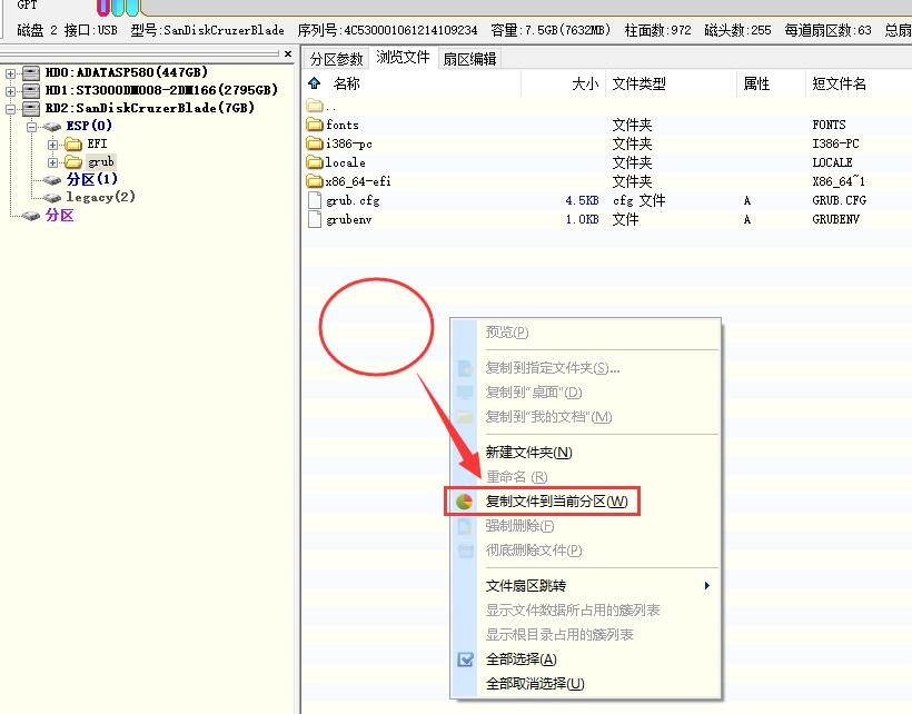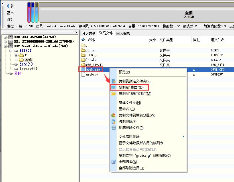 (7)返回Diskgenius,在右边grub.cfg周边空白处右键,复制文件到当前分区;
