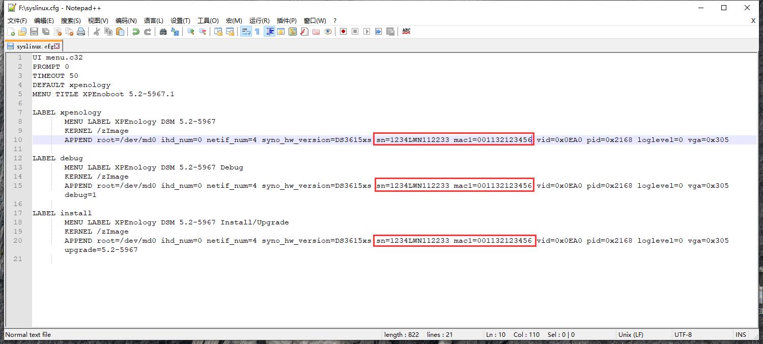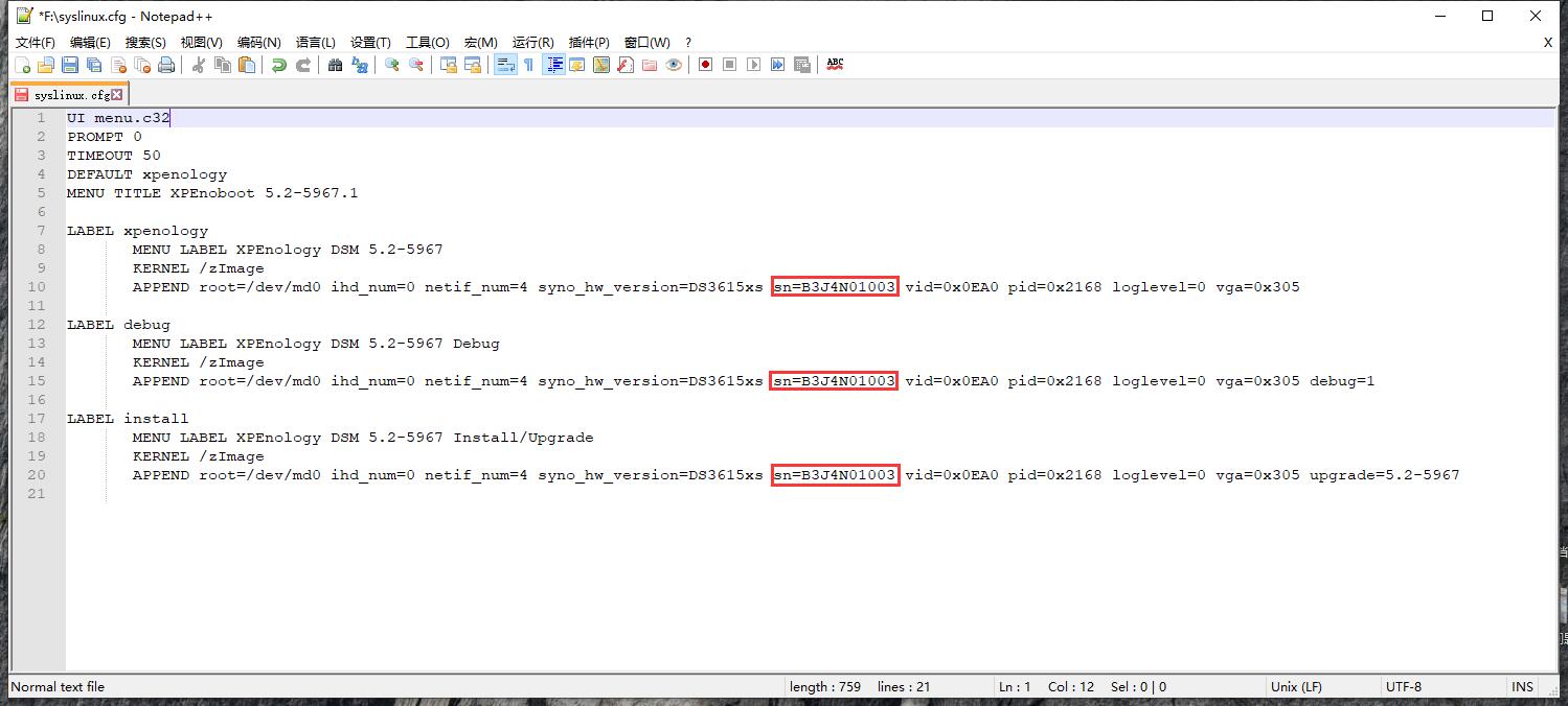 (2)用Notepad++编辑器打开syslinux.cfg(不要用记事本打开编辑,否则格式会错乱),在第10行、15行和20行,找到“sn=”;