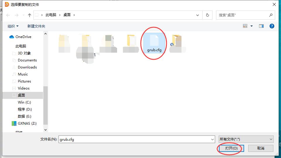 (8)在弹出的对话框中找到电脑桌面grub.cfg,打开;