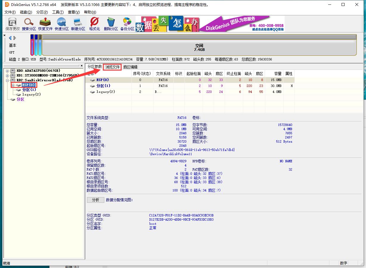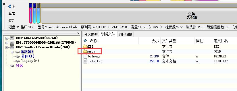 (1)把U盘插到Win系统的电脑上,打开Diskgenius(要用高于4.9的版本,版本太低的话有可能不认),找到U盘第1个分区(写有ESP字样),点:浏览文件;