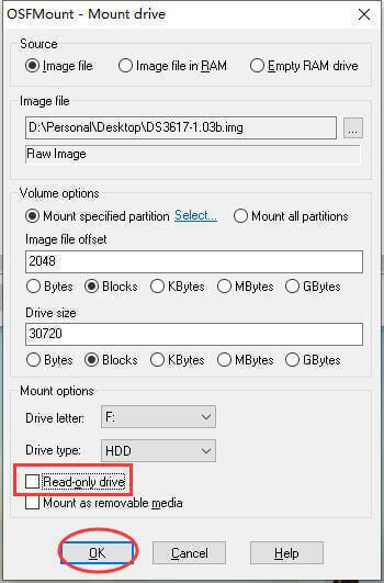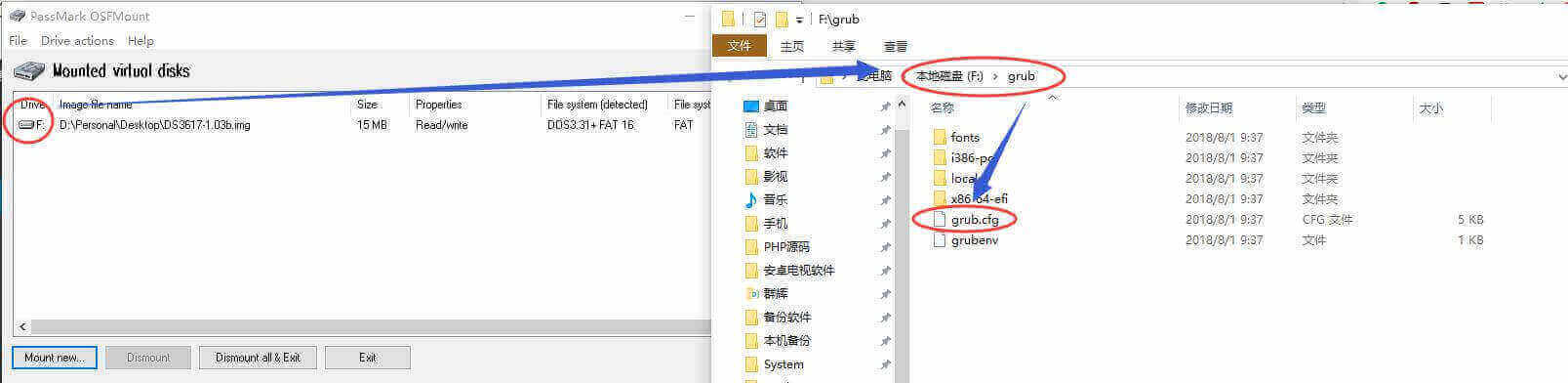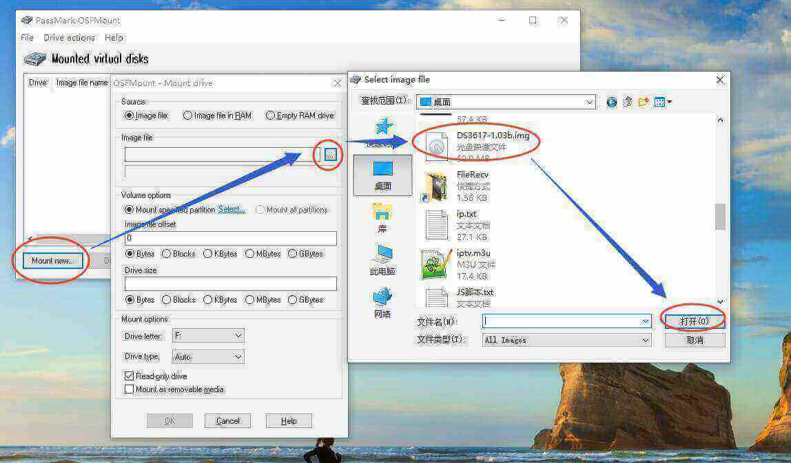2、打开“PassMark OSFMount”软件,点“Mount new”加载引导文件,点“Image file”这行字的最右边“...”按钮,选择你要需要用的引导文件(如下图,博主已经将上面下载的引导文件改名为DS3617-1.03b.img),点打开;
