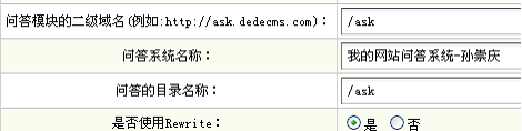 2)DedeCMS V5.7管理后台-系统-系统基本参数-模块设置,“是否使用Rewrite”选择“是”,“问答模块的二级域名”填写“ask”.