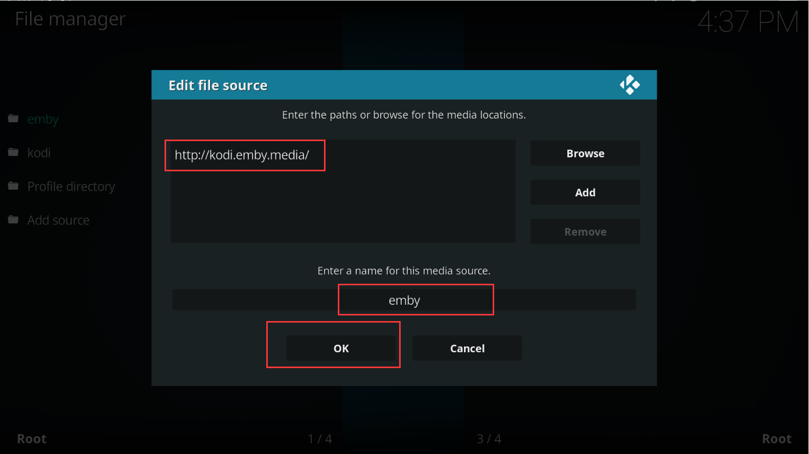 在地址入输入http://kodi.emby.media,然后起个名字。OK!