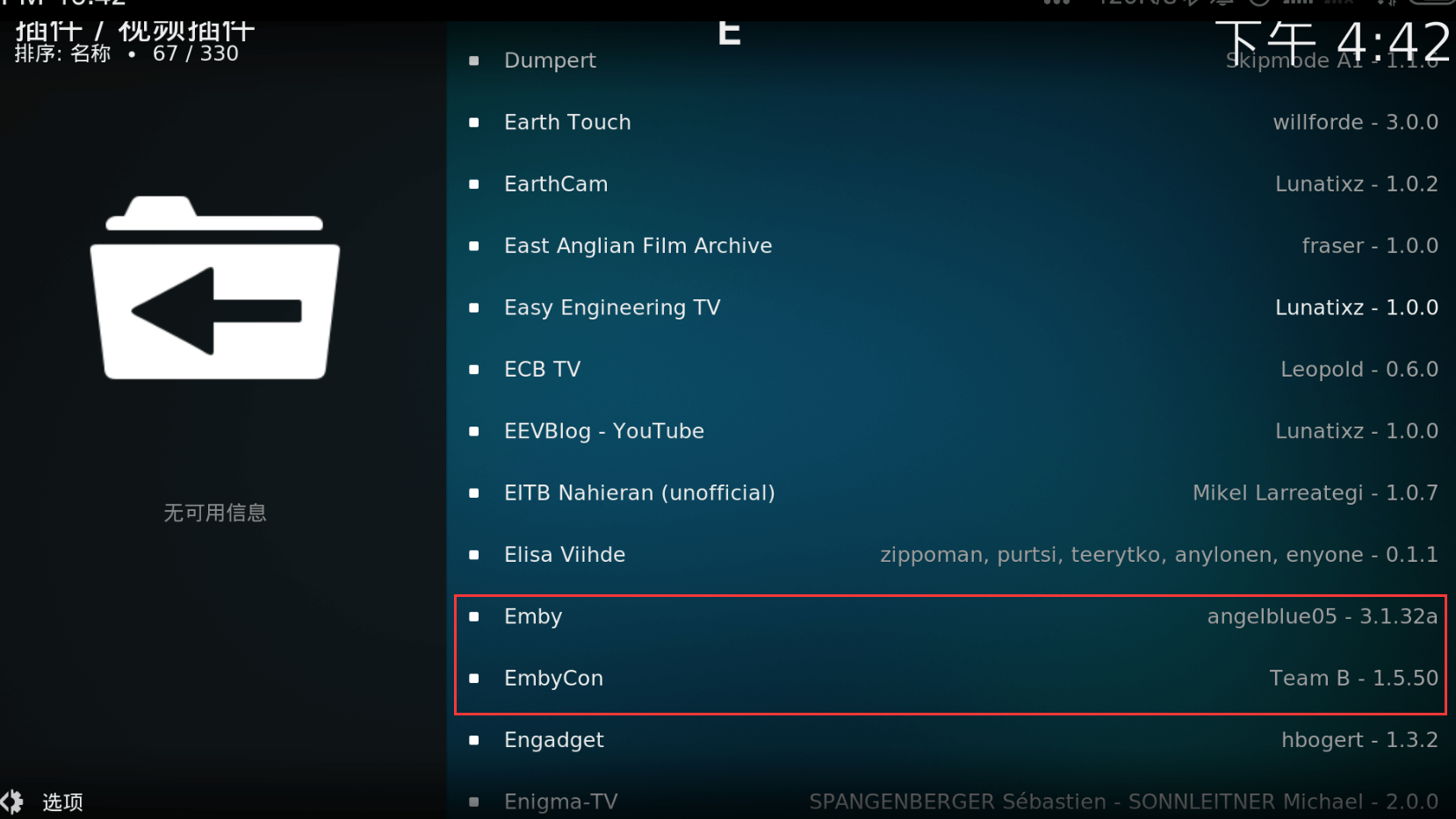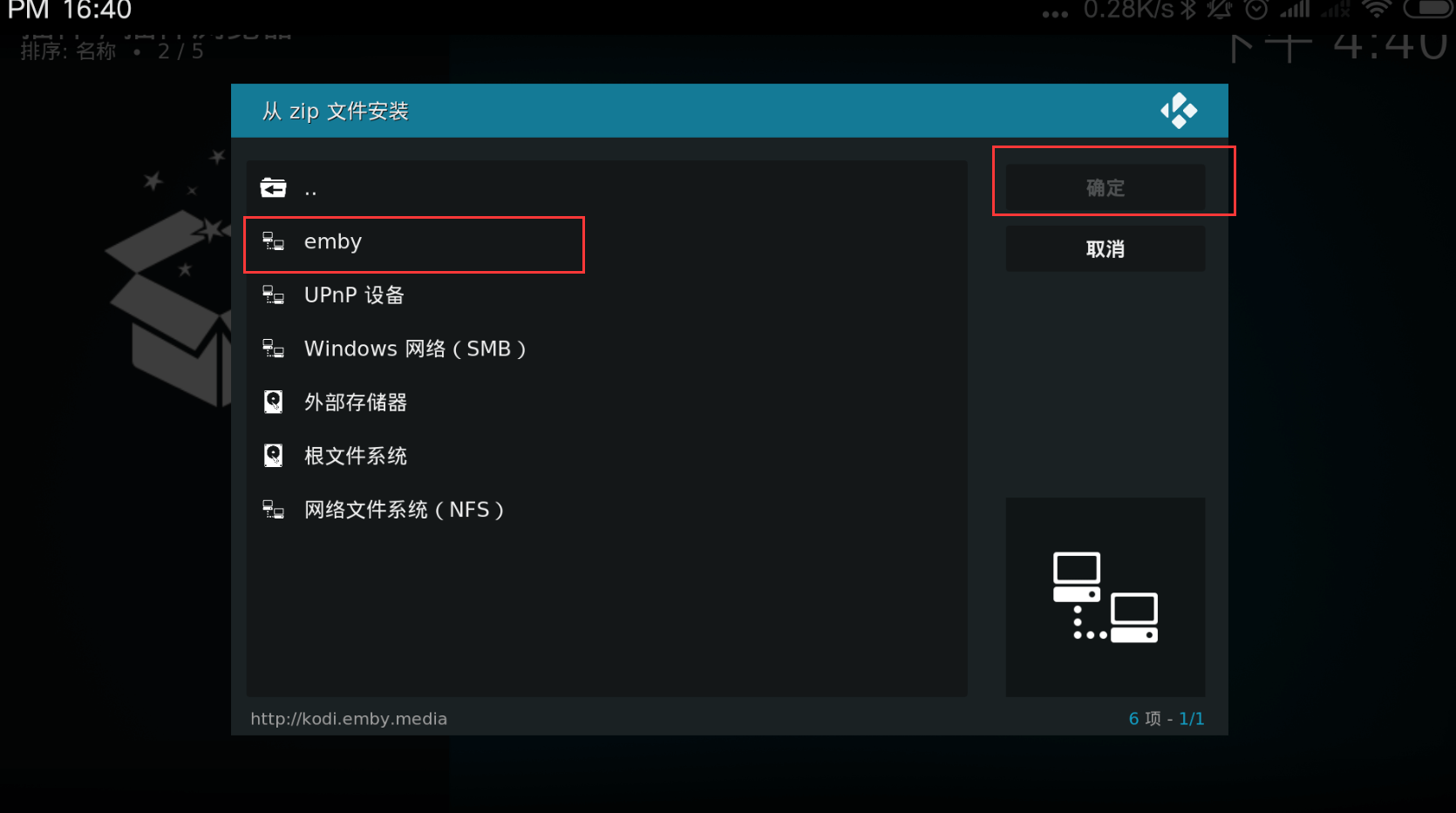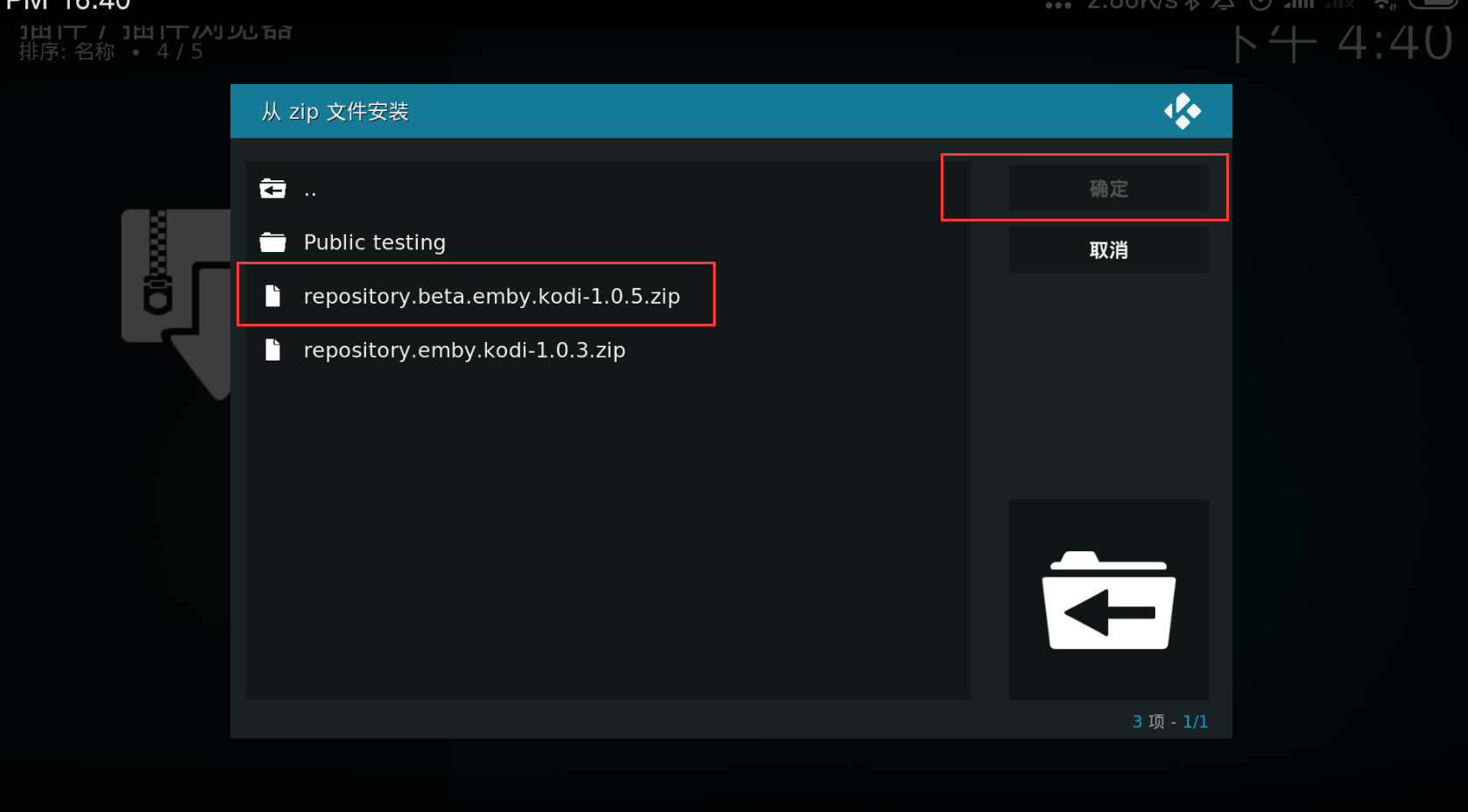 选择repository.beta.emby.kodi-10.05.zip,然后确定。