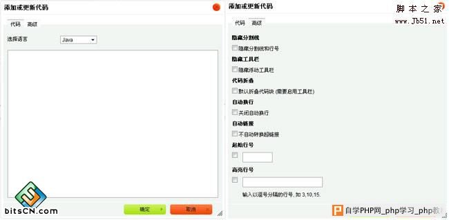 点击按钮弹出如下图所示的对话框输入代码,并且可以切换到高级选项对代码高亮显示做一些配置: