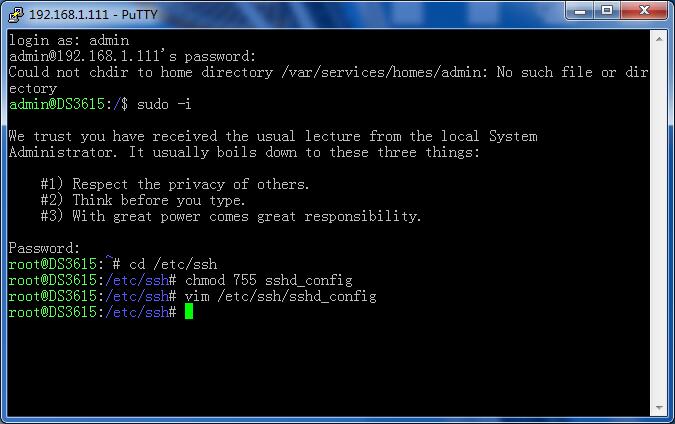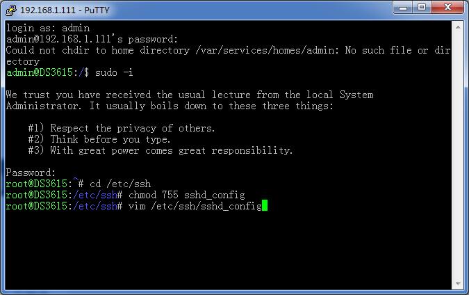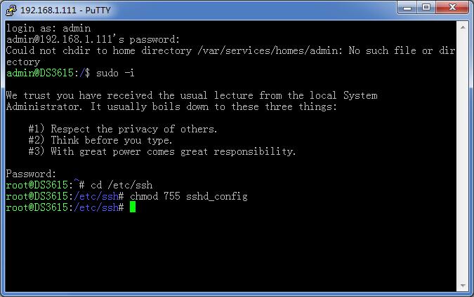 7、输入chmod 755 sshd_config回车,设置文件权限;