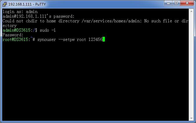 15、用synouser --setpw root命令修改root的密码(本教程以123456为例),输入完成按回车键以后就可以关掉PuTTY;