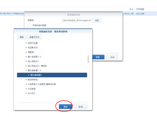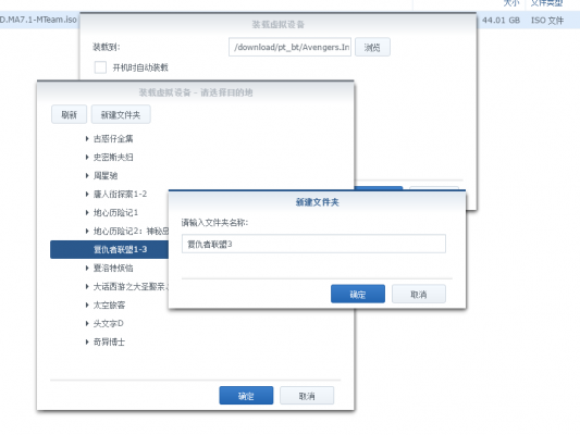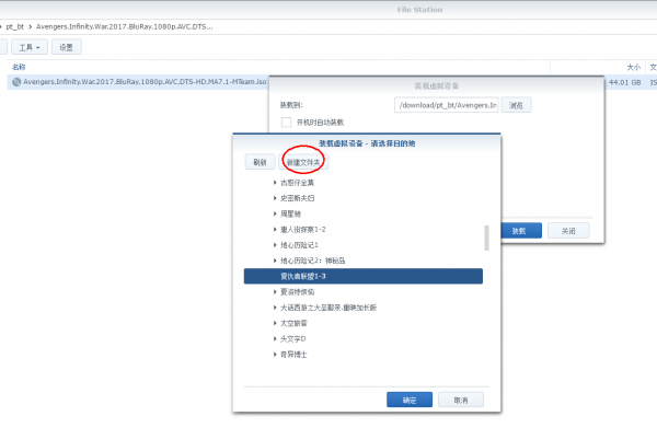 3、由于我们要放到video station套件里面让它自动索引和刮削,所以我选择的路径是群晖的video这个文件夹,之前已经建好一个“复仇者联盟1-3”的文件夹了,所以我在要把ISO挂到这个文件夹上。因此我选择新建一个文件夹;