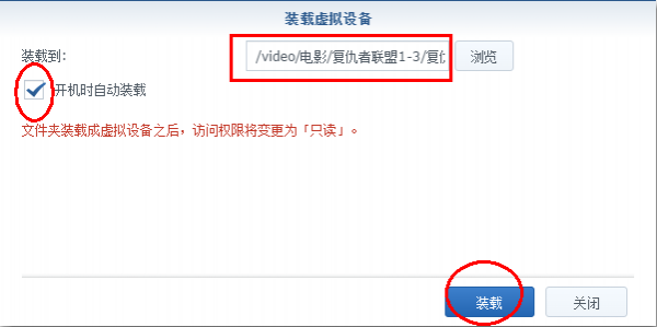 6、在“开机时自动装载”上打勾,点“装载”,这样每次群晖重启后就自动加载这个ISO文件;
