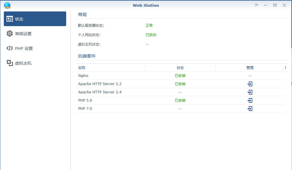 2、安装好Web Station、Apache HTTP Server 2.2、MariaDB5、PHP 5.6、phpMyAdmin一共五个套件;
