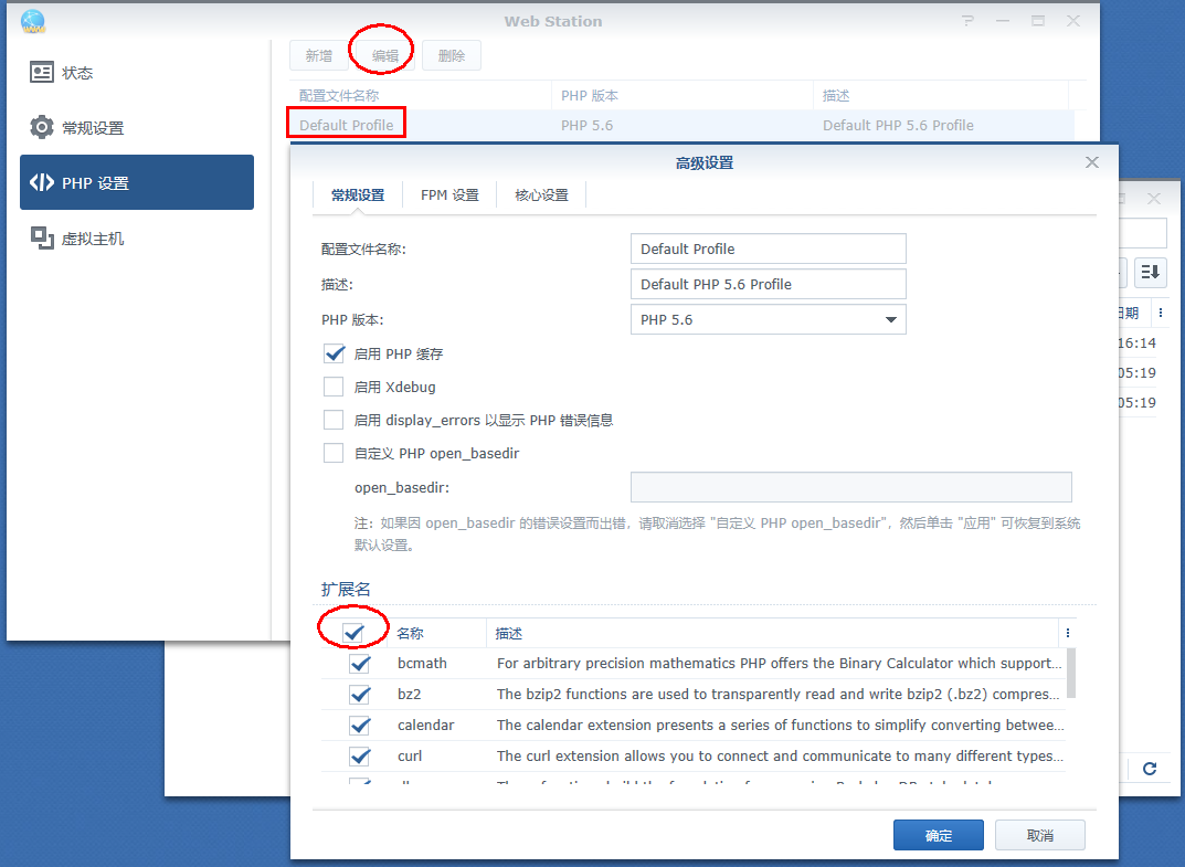 3、设置Web Station,这里需要注意:要把PHP 5.6全部的扩展名全部打勾;