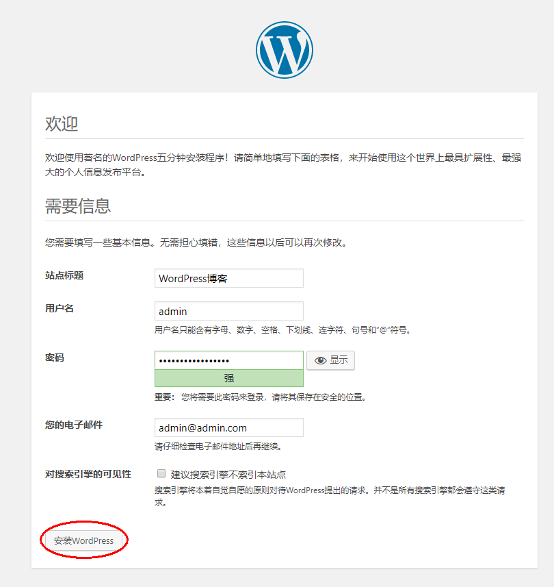 4、根据需要,输入站点标题(博客网站的名称)、用户名(管理员的名称)、密码(管理员的密码)、邮箱等,完善博客的信息后点“安装WordPress”。