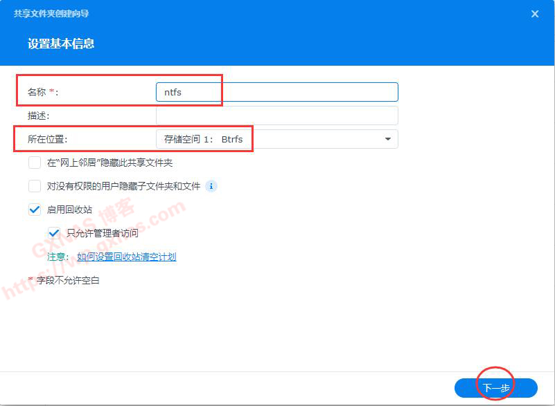 2、名称可以自己定义(只能用英文字母或者数字,不可以用中文或者特殊符号),所在位置根据实际情况选择,我这台是单个存储空间,没得选择了,下一步;