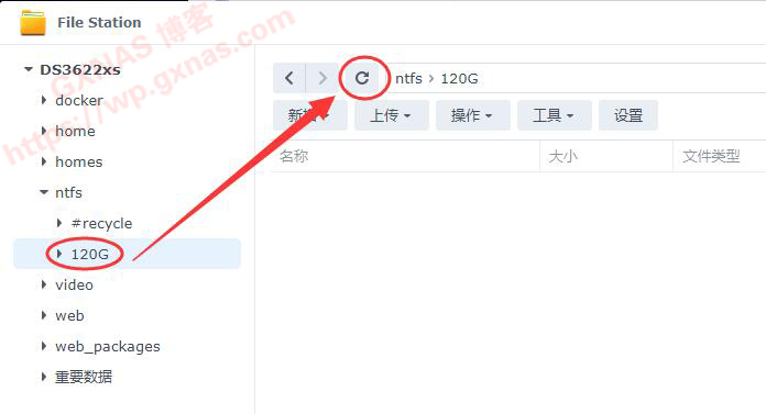 18、回到File Station,找到刚才建立的120G文件夹,点菜单上的刷新图标;