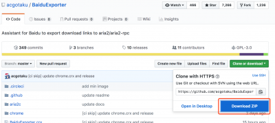 打开BaiduExporter的github页面,在master分支下,选择右侧的Clone or download项下的Download Zip,右击选择 “复制链接地址” 。