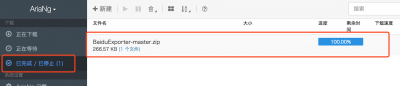 点击应用后,勾选百度网盘中要下载的文件或文件夹,选择 “导出下载” 菜单下的 “ARIA2 RPC”,会弹出 “下载成功,赶紧去看看吧!” 的提示信息。切换到AriaNg页面,我们可以看到在百度网盘上选择的文件已经在依次下载了。