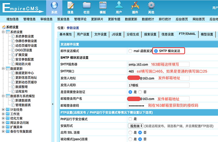 3、进入帝国cms后台->系统->系统参数设置->FTP/EMAIL,按照下图设置: