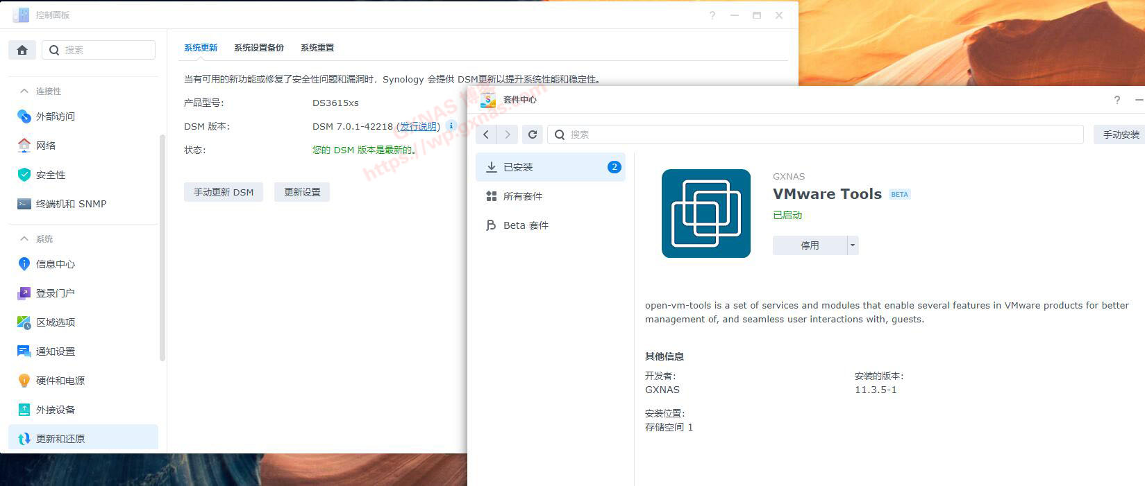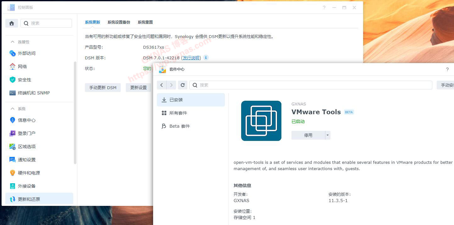 VMware Tools 是一套安装在虚拟机操作系统中的实用程序,可提高虚拟机的性能,并在 VMware 产品中实现多个易于使用的功能。对于使用VMware vSphere(ESXI)或者VMware WorkStation来安装群晖系统的用户来讲,一般都会去安装这个套件的。但是群晖系统升级7.0以后,VMware Tools一直都没有更新,最近博主看到VMware Tools有更新了,于是编译了三个套件,有需要的请自行下载: