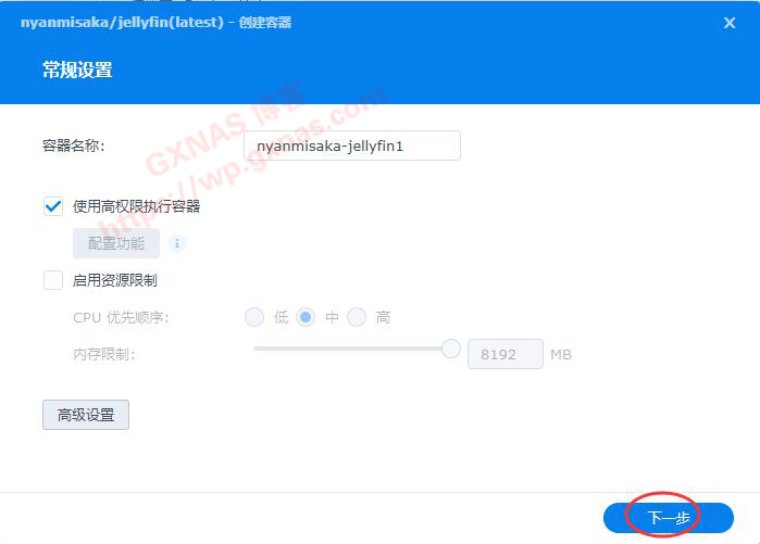 8、在“使用高权限执行容器”处打勾,再点“高级设置”;