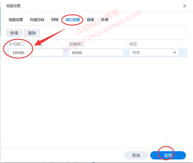 14、回到docker的jellyfin设置,在“端口设置”标签中,“本地端口”默认为8096,由于我安装的EMBY使用了8096端口,所以我这里改成18096端口,这里设置的端口和第9步的快捷方式端口必须是同一个端口号,否则到时建立的快捷方式会打不开,设置好了以后点“应用”;