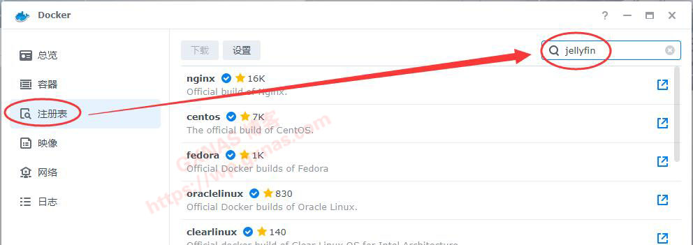 5、找到“nyanmisaka/jellyfin”,点“下载”,如果下载慢或者老是下载失败的话,请参考《修改docker加速地址提高镜像下载速度》教程设置docker加速;